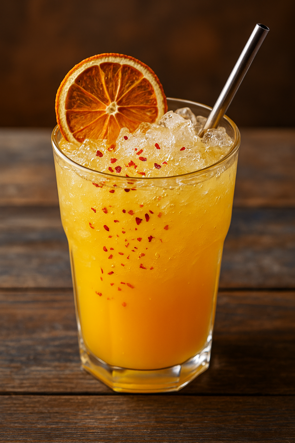 Postup: Pyré a limetku vlejte do pohára, pridajte ľad a Prosecco. Premiešajte, posypte čili a ozdobte sušeným citrusom.